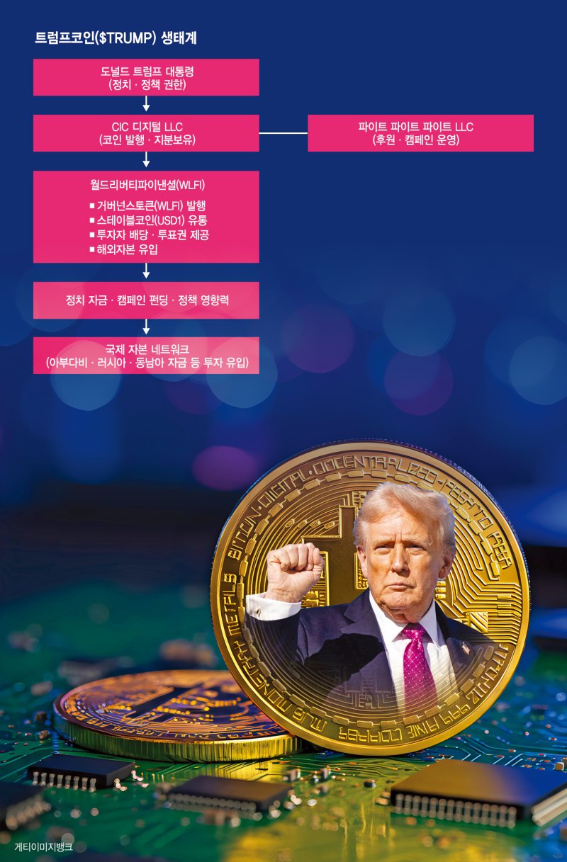트럼프는 올해 1월 솔라나 블록체인에서 $TRUMP를 공식 발행했다. 전체 발행량 10억개 가운데 8억개, 즉 80%를 본인 소유 법인인 'CIC 디지털 LLC'와 '파이트파이트파이트 LLC'가 보유하고 있다. 파이낸셜타임스(FT)에 따르면 초기 판매와 거래 수수료를 통해 3억5000만달러 이상의 현금이 유입됐다. 상위 보유자의 대부분은 트럼프 가족과 정치 후원 네트워크다.