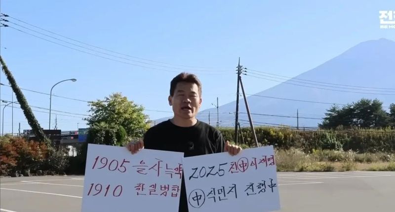 영상에는 후지산이 뒤로 보이는 곳에 선 채 전씨가 ‘1905년 을사늑약’, ‘1910년 한일병합’이라 적힌 손팻말과 ‘2025년 친中 이재명’, '中 식민지 진행 中'이라 적힌 손팻말을 양손에 들고 있다.