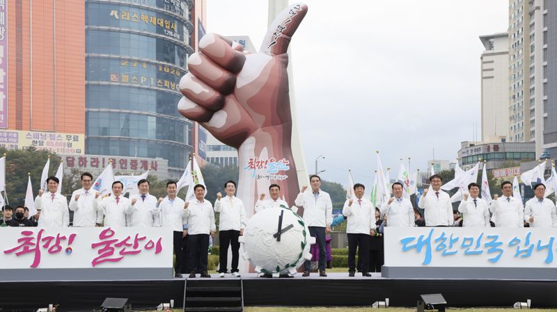 출정식에는 김두겸 울산시장과 김철 공업축제추진위원장, 이성룡 울산시의장, 지역 대표기업, 노동계, 상공계 대표 등 17명이 참석해 울산과 시민, 기업과 노동자의 화합과 발전을 위한 ‘최강! 울산’ 표어 제막식을 가졌다.