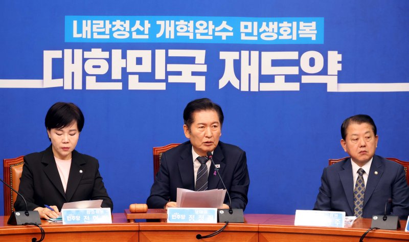 정 대표는 "오늘 사법개혁 안과 허위 조작 정보 근절안이 연이어 발표된다. 3대 개혁이 모두 첫발을 내딛는 것"이라며 "모든 건 당정대가 원팀으로 똘똘 뭉쳐 국민 눈높이에 맞는 개혁안을 위해 힘쓴 덕분"이라고 했다.