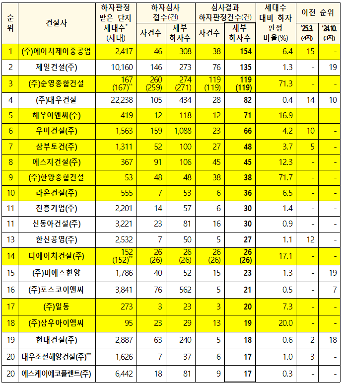 [파이낸셜뉴스] 국토교통부는 20일 하자심사분쟁조정위원회의 공동주택 하자 접수 및 처리 현황과 2025년 하반기 하자판정 결과 상위 건설사 현황을 공개했다.
