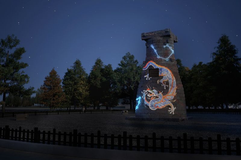 영상은 신라 천문학자가 첨성대에 올라 별을 관측하는 장면으로 시작해 은하수와 유성우, 혜성이 외벽 전체를 수놓는 장면으로 이어진다.