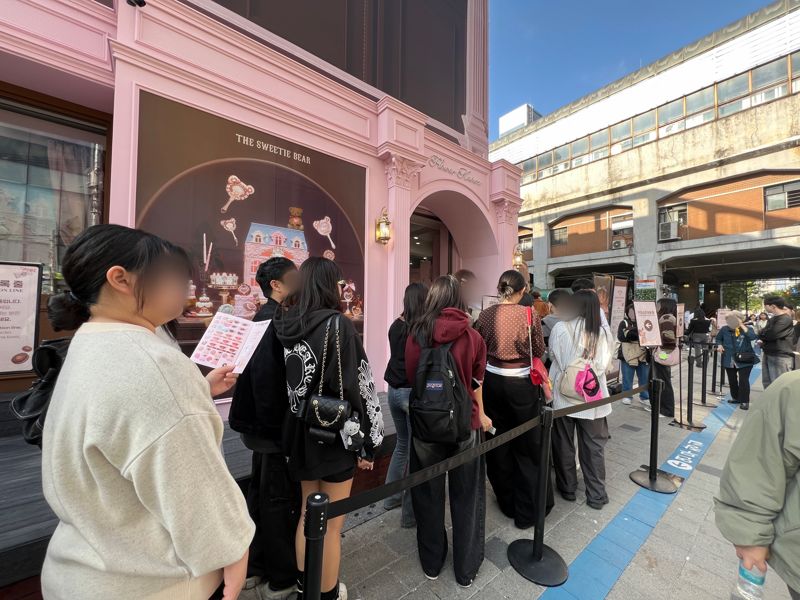 [파이낸셜뉴스] 지난 19일 오후 서울 성수동 지하철 2호선 성수역 3번 출구 앞. 성수동 중심거리 입구에 우뚝 선 핑크빛 건물이 시선을 사로잡았다. 건물 앞에서는 사람들이 초대형 곰인형 조형물과 사진을 찍기 위해 직원 안내에 따라 줄을 서고 있었다. 건물 내부로 입장하기 위해 웨이팅 등록을 하려는 대기줄도 길게 이어졌다. 10분 정도 기다린 끝에 등록에 성공했다. 하지만 앞 대기팀은 200팀 이상, 예상 소요시간은 3시간 이상이라는 카톡 안내 메시지가 도착했다.