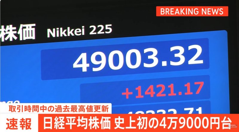 이날 도쿄증권거래소에서 닛케이지수는 전거래일 대비 1603(3.37%) 오른 4만9185로 최고치를 갱신했다. 종가 기준 4만9000을 돌파한 것은 이번이 처음이다.