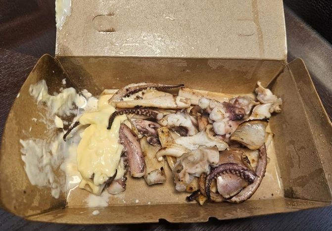 A씨가 공개한 사진에는 종이상자 한쪽에 마요네즈 자국과 오징어 다리 몇 개가 담긴 모습이 찍혀 있었다.