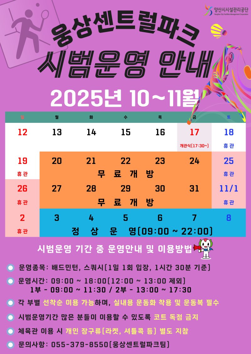 이번 시범 운영은 본격적인 운영에 앞서 시설 점검과 운영체계 안정화를 위한 사전 단계로 마련됐다. 이에 따라 실내체육관 내 배드민턴장과 스쿼시장이 시민들에게 무료로 개방된다.