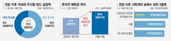 가상자산 거래소 업비트에서 비트코인은 지난 9일 1억7986만9000원으로 사상 최고가를 새로 썼다. 특히 해외주식에 투자하는'서학개미'의 연초 이후(10월 17일 기준) 순매수 상위 종목을 살펴보면 암호화폐 투자회사인 '비트마인 이머전 테크놀로지스'과 스테이블코인 발행사인 '서클'을 각각 9억8350만달러, 8억9785만달러 사들이며 순매수 1위와 2위에 올렸다.