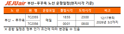 이 노선은 오는 12월 17일부터 2026년 3월 2일까지 김해국제공항에서 오후 6시 55분(현지시각)에 출발해 밤 11시 정각에 베트남 푸꾸옥공항에 도착한다. 푸꾸옥공항에서는 오전 0시 1분에 출발해 다음날 아침 8시에 김해공항에 도착하는 일정이다.