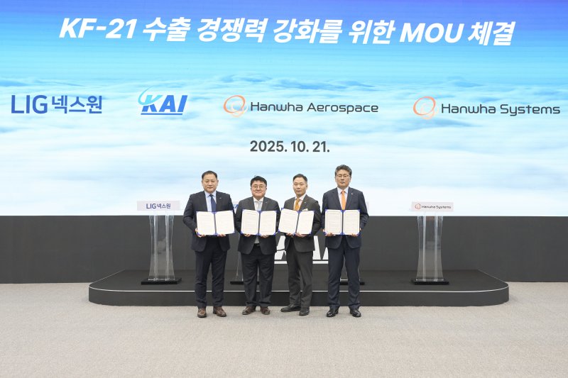 KAI는 21일 경기 고양 킨텍스에서 열린 서울 국제 항공우주 및 방위산업 전시회(ADEX) 2025에서 한화에어로스페이스·한화시스템(·LIG넥스원과 이같은 내용의 양해각서(MOU)를 체결했다고 전혔다.