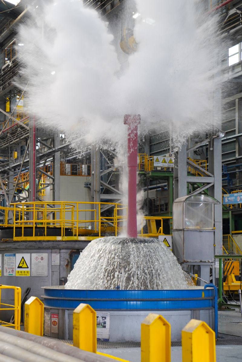 [경남 창원=박신영기자] 20일 경남 창원시에 위치한 세아창원특수강의 특수제강공장에 들어서자 대형 포신(포의 몸통)이 눈길을 끌었다. 시뻘겋게 달아올라있는 3.8t에 달하는 포신을 물이 가득 담긴 커다란 저장고에 넣자 물이 사방으로 튀기며 하얀 수증기가 공장 안을 가득 채웠다. 이 작업은 퀜칭 열처리 작업으로 약 900도까지 가열한 후 물로 상온까지 냉각시켜 제품의 강도를 증가시킨다. K9 자주포에 쓰이는 이 포신은 세아창원특수강에서 제조하고 있다. 오상훈 특수제강공장 팀장은 “포신은 세아창원특수강에서만 만든다"며 "K-방산이 특수를 누리면서 포신 주문량이 2배로 늘었다"고 말했다.