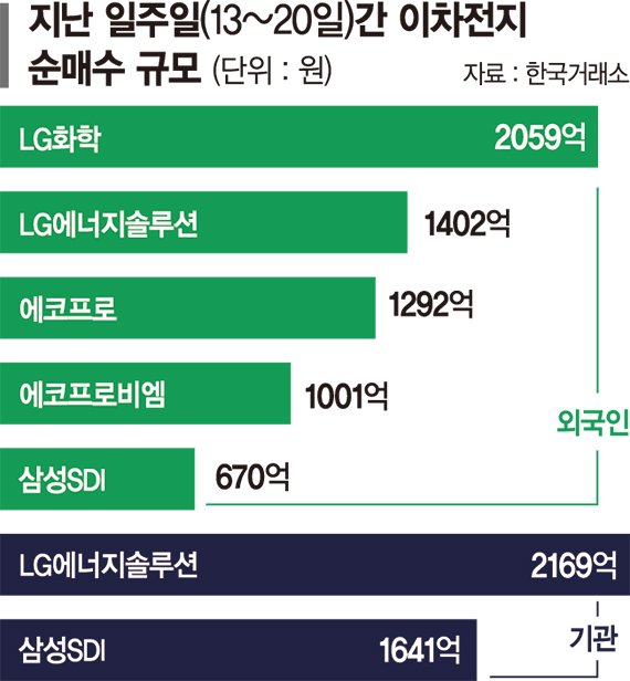 외국인 투자자들의 자금은 최근 이차전지 쏠림 현상이 뚜렷하다. 이차전지는 전기차 캐즘(수요 정체) 우려로 시장에서 소외되는 모습을 보였으나, 최근 업황 개선 기대감이 커지면서 외국인과 기관 투자자 모두 이차전지를 장바구니에 담는 모습이다. 지난 일주일간(13~20일) 외국인 순매수 상위 10개 종목 중 5개 종목도 이차전지주로 나타났다. 지난주 국내 ETF 시장에서 수익률 상위 10개 종목 모두 이차전지 관련 ETF가 차지했다.