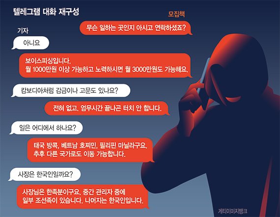 캄보디아 사태가 공론화된 이후에도 중국 범죄조직 '복건갱'의 구인은 여전히 활개를 치고 있는 것으로 파악됐다. 본지는 21일 구인구직 사이트를 통해 올라온 '해외 텔레마케터(TM) 모집공고'를 보고 무작위로 3곳을 선정, 연락을 취한 결과 이들은 고소득을 보장하며 "보이스피싱 업무"라고 스스로 밝혔다. 이들 조직은 "감금이나 고문·구타는 일체 없다"면서 "여자친구나 가족들과도 같이 살 수 있는 거처를 마련해주겠다"라며 기자를 유혹했다.