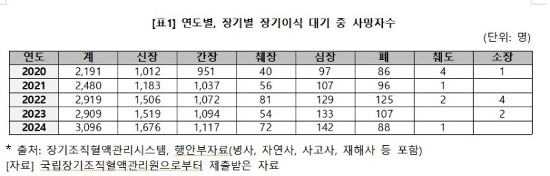 22일 국회 보건복지위원회 소속 박희승 국회의원이 국립장기조직혈액관리원으로부터 제출받은 자료를 분석한 결과, 장기이식 대기 중 사망자수는 2020년 2191명에서 지난해 3096명으로 1.4배 증가했다.