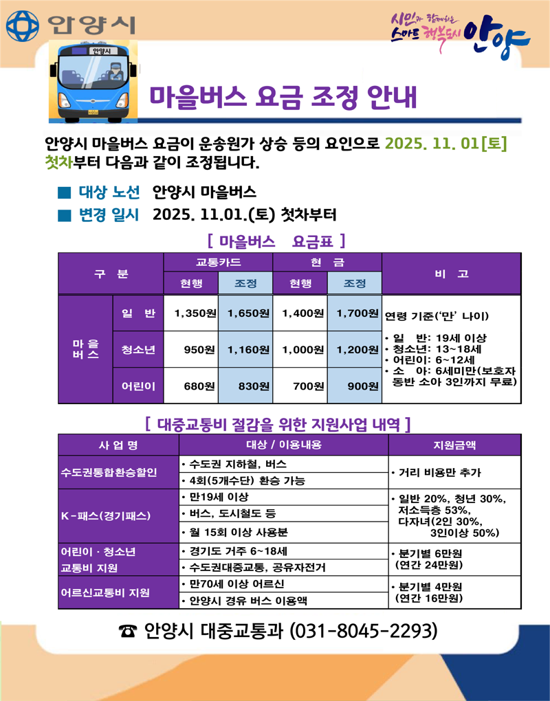 11월 1일부터 안양시 관할 마을버스 노선에 일괄 적용된다.