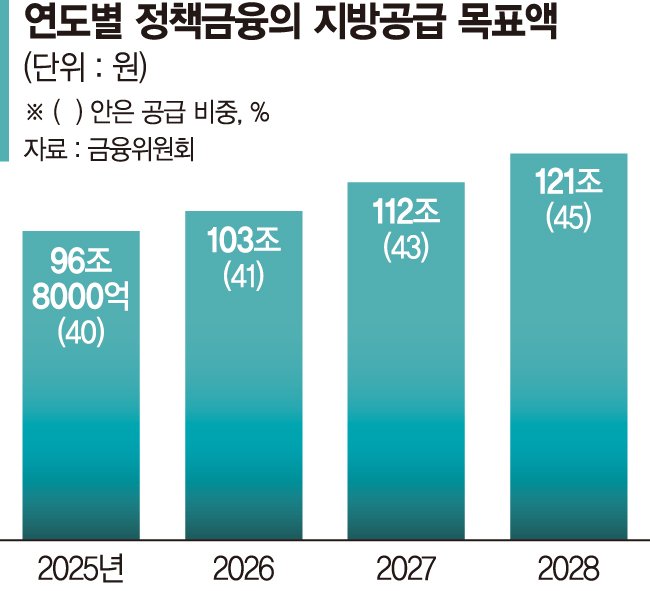금융위는 지방우대 금융 정책으로 내년부터 4개 정책금융기관에 '지방금융 공급확대 목표제'를 신설해 약 40% 수준인 지방공급액 비중을 2028년까지 45%로 5%p 이상 높일 계획이다. 이를 통해 비수도권 자금 공급규모가 현재 연간 96조8000억원에서 25조원 이상 늘어 120조원을 넘을 수 있을 것이라는 계산이다.