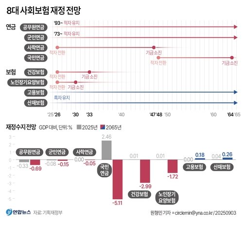 노인부양을 지탱하는 국민연금 등 사회보험 재정도 심각하게 악화된다. 보험료율과 소득대체율을 소폭 조정한 개혁 정도에 그친 현재의 국민연금은 2048년 적자로 돌아서고, 2064년 기금이 고갈된다.