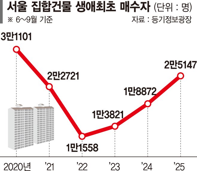 22일 법원 등기정보광장에 따르면 새 정부가 출범한 지난 6월부터 9월까지 서울 아파트 등 집합건물 생애최초 매수자는 2만5147명으로 집계됐다. 동기간 기준으로 2020년 이후 가장 많은 건수다.