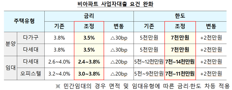 국토부는 오는 2027년 말까지 비아파트 건설자금의 대출금리를 0.2~0.3p 낮추고, 대출한도는 2000만원 상향하기로 했다. 이에 따라 민간사업자가 비아파트를 분양하는 경우 가구당 최대 7000만원까지 대출받을 수 있으며, 금리는 3.5%로 인하된다.