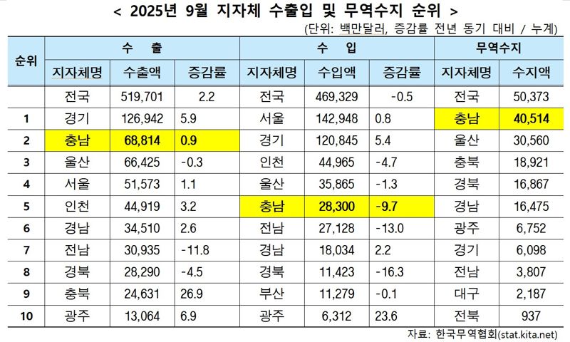 23일 충남도의 2025년 9월 수출입 동향 보고에 따르면 올들어 9월까지 누적 수출액은 688억 달러, 수입액은 283억 달러로 무역수지(누계)는 405억 달러 흑자를 냈다.
