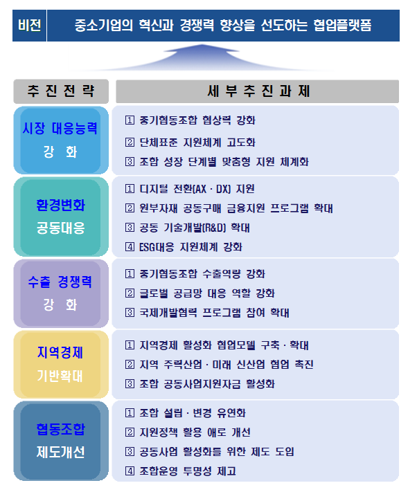 23일 중소벤처기업부는 '제4차 중소기업협동조합 활성화 3개년 계획'을 발표했다. 이번 계획을 기반으로 중기부는 중소기업협동조합 중심의 △시장 대응능력 강화 △대내외 환경변화 공동 대응 △수출 경쟁력 강화 △지역 경제 기반 확대 △제도 개선 등 5대 전략과 15개 세부 과제를 중점 추진한다.