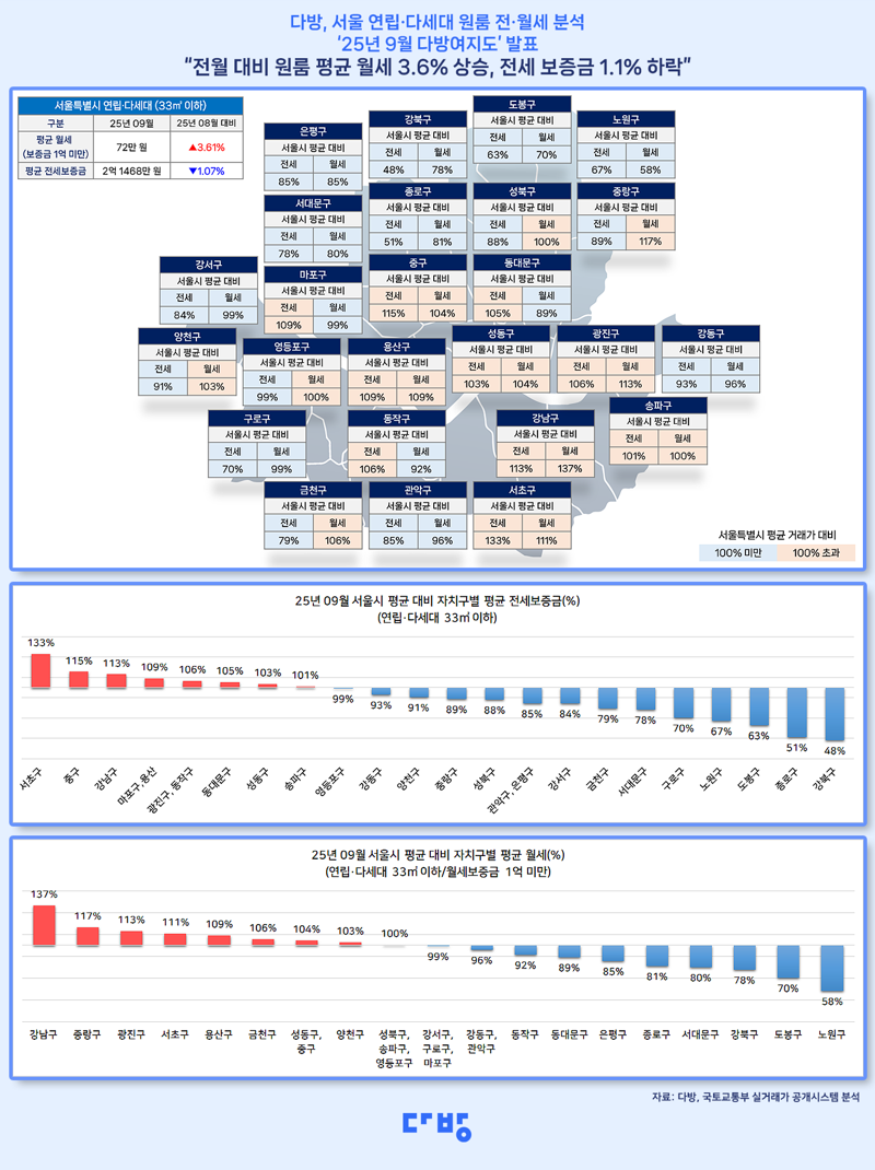 23일 다방이 공개한 다방여지도에 따르면 지난 9월 서울 전용면적 33㎡ 이하 연립·다세대 원룸의 보증금 1000만원 기준 평균 월세는 72만원, 평균 전세 보증금은 2억1468만원을 기록했다. 8월과 비교하면 월세는 2만원(3.6%) 오르고, 전세 보증금은 233만원(1.1%) 줄어든 수치다.