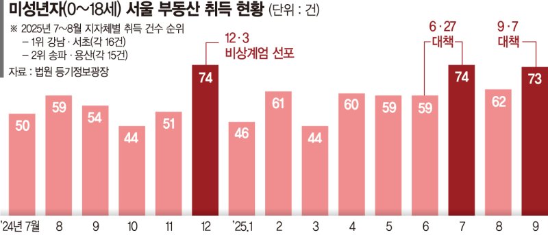 23일 본지가 법원 등기정보광장의 소유권이전등기(매매) 신청 매수인 현황을 분석한 결과, 0~18세 미성년자가 서울 부동산(건물·집합건물·토지)을 취득한 건수는 지난해 12월과 올해 7월, 9월 눈에 띄게 증가했다.