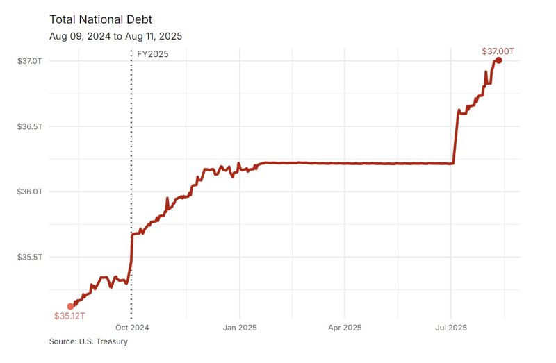 미국의 부채는 2024년 1월 34조달러, 7월 35조달러, 11월 36조달러를 각각 넘어선 데 이어 불과 10개월 만에 2조달러 이상이 늘었다.