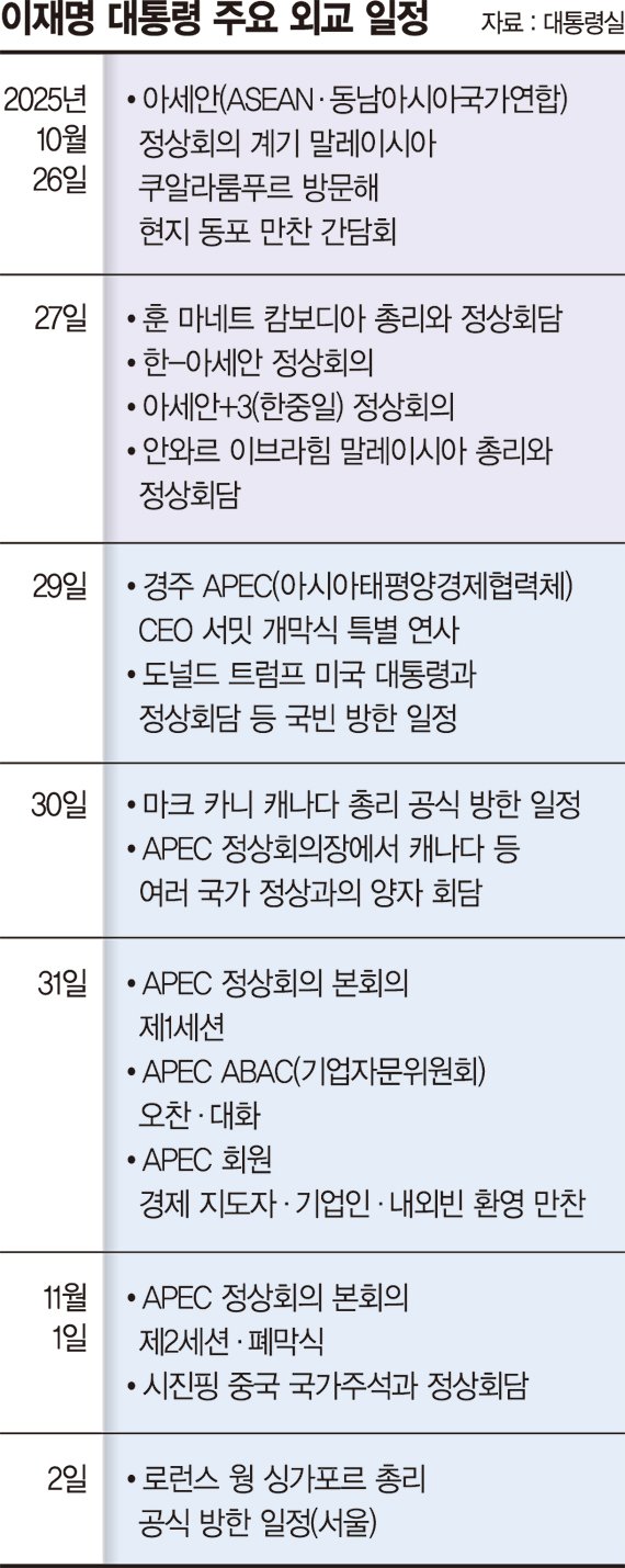 아세안 관련 정상회의는 27일 저녁까지 열리지만 이 대통령은 이어지는 경주 APEC 정상회의 준비를 위해 같은 날 오후 귀국길에 오른다. 나머지 일정은 조현 외교부 장관과 여한구 통상교섭본부장이 수행할 예정이다.