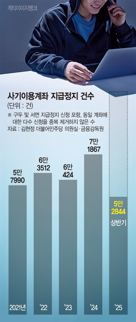 26일 금융감독원이 김현정 더불어민주당 의원실에 제출한 자료에 따르면 사기이용계좌 지급정지 건수가 급증하고 있다. 지난 2023년 6만424건에서 지난해 7만1867건으로 늘었다. 올해 상반기에는 5만2844건에 달했다. 단순 계산으로는 올해 10만건을 돌파할 것으로 예상된다.