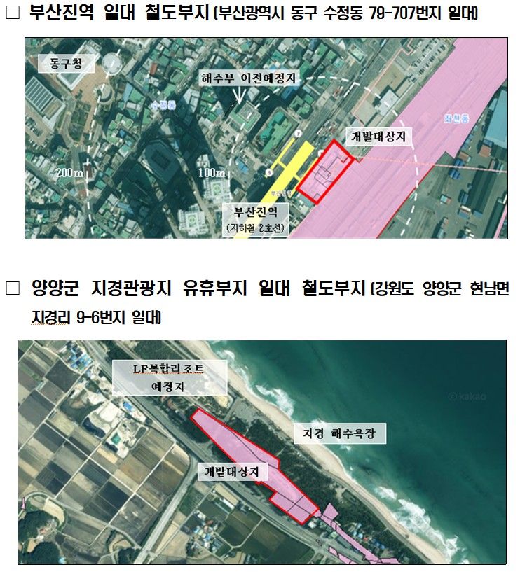이성해 국가철도공단 이사장은 “행정·상업 기능이 발달한 부산진역 일원과 수려한 자연경관을 지닌 양양 지경 관광지 인근 터는 모두 높은 개발 잠재력을 가진 지역”이라며 “이들 부지가 지역의 새로운 성장 거점으로 재탄생할 수 있도록 이번 공모에 많은 관심을 바란다”고 말했다.