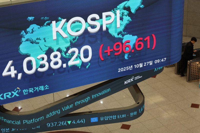27일 오전 10시30분 코스피 지수는 전 거래일 대비 80.14p(2.03%) 오른 4021.73에 거래되고 있다. 이날 지수는 3999선에 출발한 뒤 개장 직후 4000선을 넘어섰다. 장중 4038.39까지 오르면서 역대 최고가를 갈아치웠다.