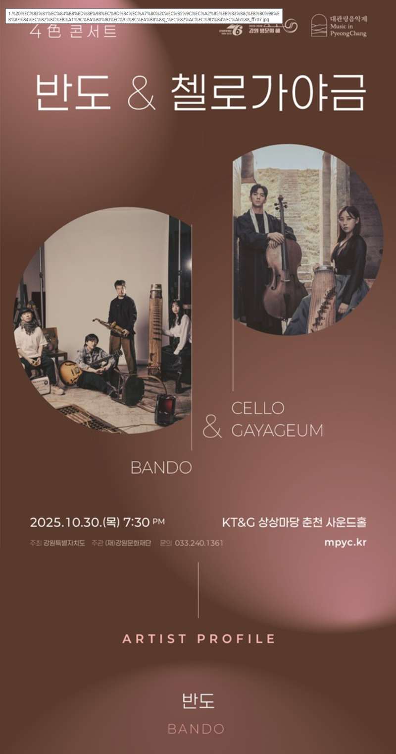 첫 공연 '반도&첼로가야금'은 두 팀의 퓨전 국악 무대로 펼쳐진다. '반도'는 바다, 강, 섬 등 한국의 지형적 특징을 소재로 곡을 만들어 연주하며 황진아(거문고), 이시문(기타), 김성완(색소폰), 김수준(드럼) 등 4명의 연주자들로 구성된 컨템포러리 음악 프로젝트 팀이다.