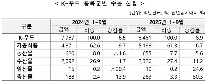 수산물은 김 수출 호조 등에 힘입어 11.2% 증가한 23억 3000만 달러를 기록했으며, 축산물은 2억 8000만 달러로 50.3%의 높은 증가율을 보였다. 농산물과 임산물도 각각 5.6%와 24.6%늘었다.