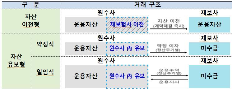 거래 시점에 재보험료를 지급하지 않아 자산이전형에 비해 유동성 부담이 없고 신용위험 경감이 가능하며, 약정식 자산유보형 대비로는 재보형비용이 저렴하다는 장점을 갖췄다. 다만 구조가 복잡하고 정산 시점마다 재보험료 상당 자산의 운용수익 측정(공정가치 평가 등)이 필요하다는 한계를 지닌다.