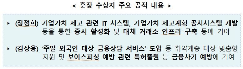 28일 금융위원회에 따르면 이날 서울 여의도 FKI타워 열린 제10회 ‘금융의 날’ 기념식에서 혁심금융 부문 철탑산업훈장은 장정희 한국거래소 부장에게, 포용부문 국민훈장석류장은 김상용 신한은행 팀장에게 수여됐다.