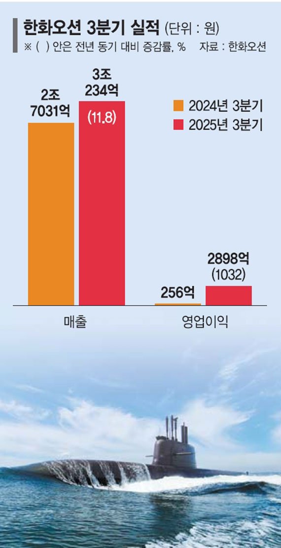 이날 한화오션은 3·4분기 매출 3조234억원, 영업이익 2898억원을 기록했다고 공시했다. 직전 분기 대비 매출 8%, 영업이익 22% 감소했지만 전년 동기 대비 매출 11.8%, 영업이익 1032% 상승해 흑자폭을 늘렸다. 올해 누적 기준 매출 9조4606억원, 영업이익 9201억원을 기록했다. 전년 동기 대비 매출 26%, 영업이익 1235% 상승했다.
