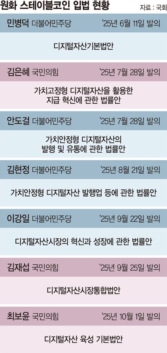 22대 국회 들어 원화 스테이블코인 규제를 담은 법안은 △민병덕 의원 △김은혜 의원 △안도걸 의원 △김현정 의원 △이강일 의원 △김재섭 의원 △최보윤 의원 등 여야를 가리지 않고 발의됐다.