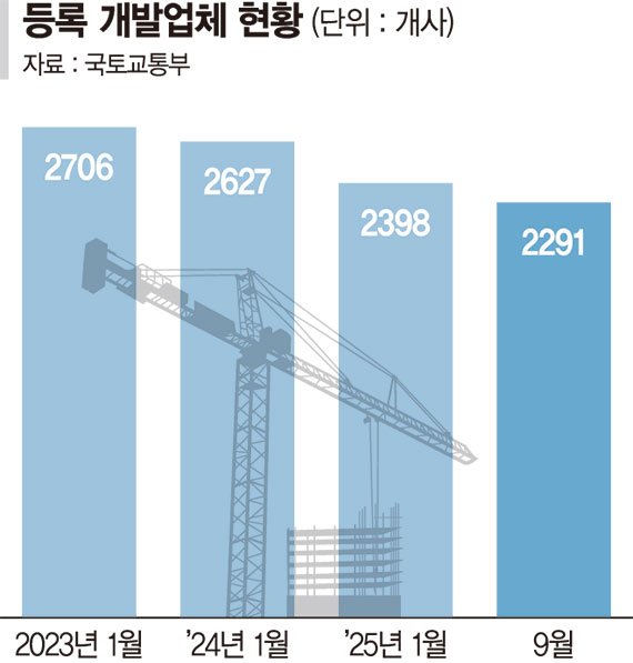 한편 시장 상황이 나아지지 않으면 등록 개발업체는 갈수록 줄고 있다. 국토교통부에 따르면 지난 2023년 1월 2706개사에서 매해 감소해 올 9월에는 2291개로 줄어든 상태다.