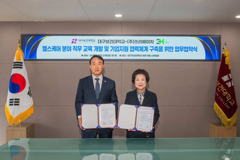 【파이낸셜뉴스 대구=김장욱 기자】대구보건대와 ㈜쓰리에이치가 헬스케어 직무교육 개발을 위해 손을 맞잡았다.