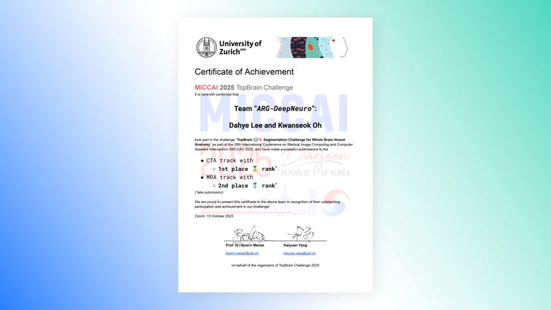 이 대회는 지난 9월 대전에서 열린 ‘MICCAI(국제의료영상처리학회) 2025’의 공식 등록 챌린지로, AI 모델이 뇌영상 데이터셋에서 주요 혈관을 식별해 라벨링하고 3D 구조의 분할 정확도를 평가한다. 기존 윌리스 고리(대뇌동맥륜) 영역의 데이터셋을 다룬 대회와 달리, 뇌 전체 주요 동맥 및 정맥의 40여 개 구조를 주석화한 데이터셋을 활용해 AI 모델의 성능을 겨룬다.