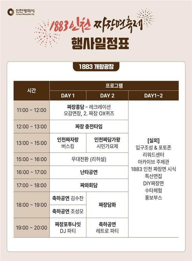 이 밖에도 어린이를 위한 키즈 클래스와 공연, DIY 짜장면 만들기 체험, 수타면 체험, 짜장면 독서존, 스탬프 투어, 거리 이벤트, 시식·시음 행사 등 남녀노소 누구나 즐길 수 있는 다채로운 프로그램이 마련된다.