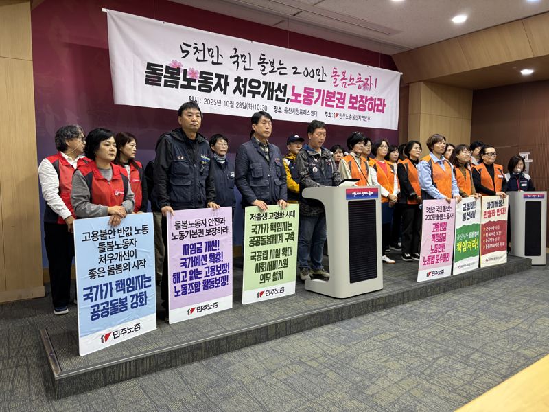 민주노총 울산지역본부는 "돌봄 노동자의 현실은 평균임금 160여만 원, 고용불안, 최저임금, 성희롱, 갑질 등으로 인해 노동환경이 극도로 열악하다"라며 "그 원인은 정부가 돌봄노동 일자리를 만든 이후 돌봄 노동자의 처우개선을 단 한 번도 추진한 적이 없기 때문이다"라고 지적했다.
