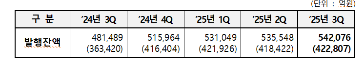 발행형태로는 전체 발행금액 중 공모가 81.8%로 10조4559억원 규모고 사모는 18.2%로 2조3240억원 규모다. 공모는 직전분기(9조9262억원) 대비 5.3% 증가했고 전년동기(7조8247억원) 대비 33.6% 증가했다.