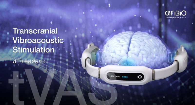 아리바이오가 개발한 치매 전자약은 ‘경두개 음향진동자극(tVAS)’ 기술을 적용한 비침습 뇌자극 기기다. 특정 저주파의 음향 진동을 두개골을 통해 전달해 신경망 활성화와 인지 기능 저하 완화를 유도한다.