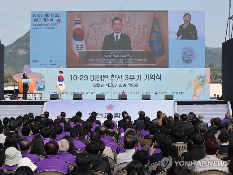 이 대통령은 이날 오전 광화문광장에서 열린 3주기 기억식에서 영상 추모사를 통해 "3년 전, 서울 한복판 이태원 골목에서 159명의 소중한 생명이 너무나 허망하게 우리 곁을 떠났다"며 이같이 말했다.