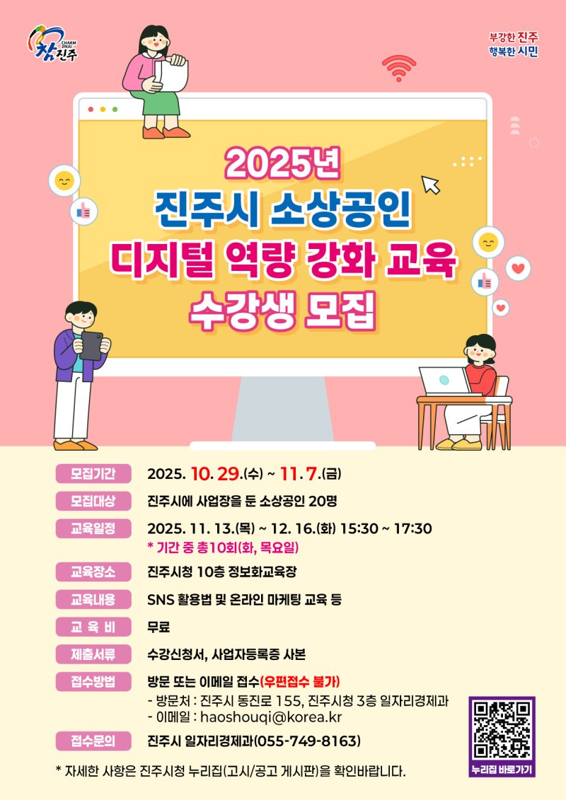 [진주=뉴시스] 정경규 기자 = 경남 진주시는 29일부터 11월7일까지 소상공인의 온라인 활용 및 홍보 능력 향상을 위해 ‘2025년 진주시 소상공인 디지털 역량 강화 교육’ 수강생을 모집한다.