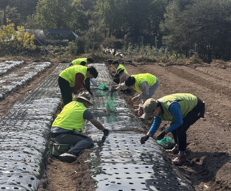 이날 정보보호부문 정태영 부행장과 임직원들은 농업인구 감소로 인해 어려움을 겪고 있는 농가를 찾아 양파와 마늘 식재, 경작지 잡초제거 등을 진행했다.