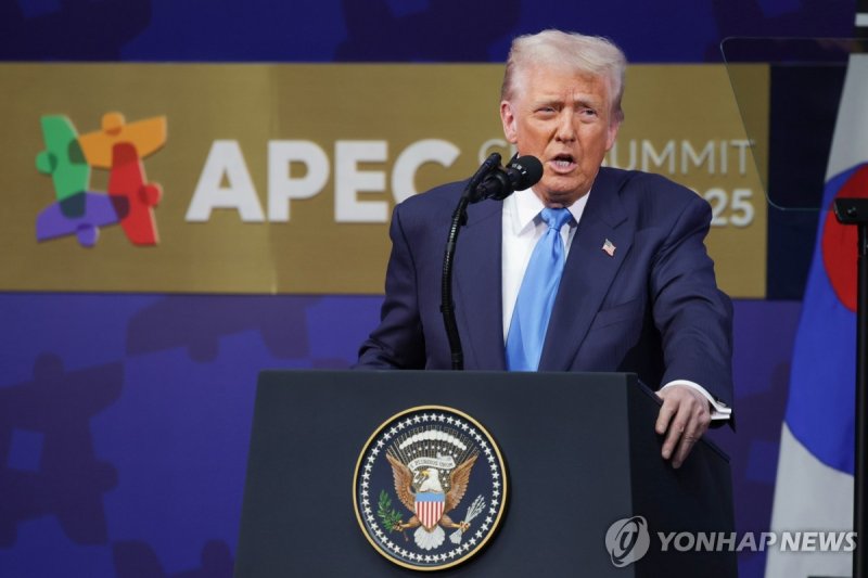 [경주APEC] 트럼프, 하늘색 넥타이·남색정장 차림…수시로 주먹 쥐어보여방한 첫 공식 일정, CEO 서밋 특별연설…삼엄 경계 속 이동 '철통보안'