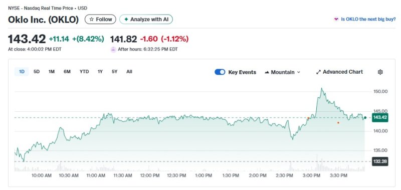 29일(현지 시각) 뉴욕증시에서 대표적 원전주인 오클로는 8.42% 급등한 142.42달러를 기록했다.