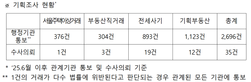 국토교통부는 서울 주택 이상거래, 전세사기, 기획부동산 등 불법행위를 지속적으로 조사해 총 2696건을 국세청·금융위 등 관계기관에 통보하고, 이 중 35건을 경찰에 수사의뢰했다.